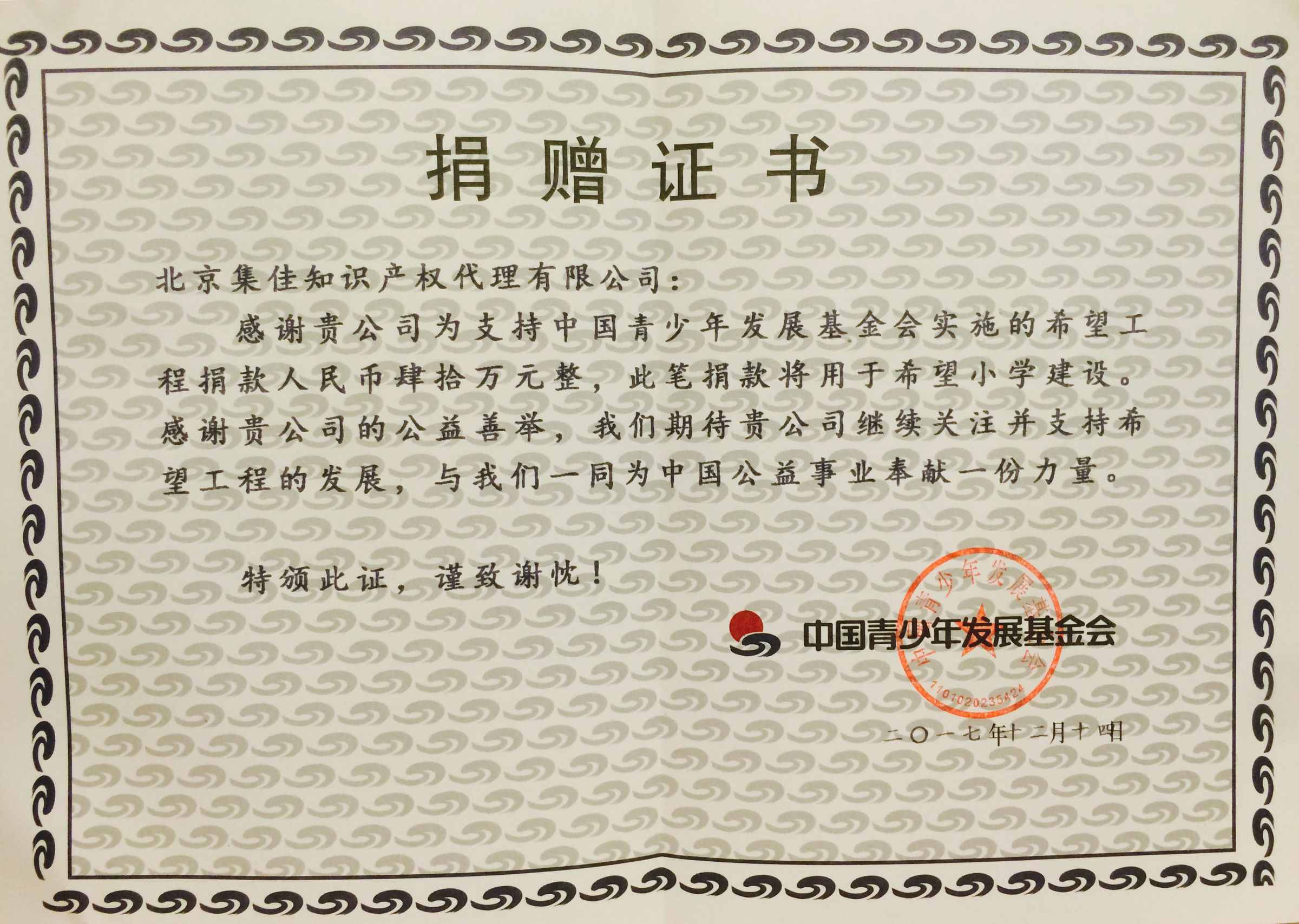 雙旦來(lái)臨之際,集佳也迎來(lái)了一個(gè)好消息。中國(guó)青少年發(fā)展基金會(huì)再一次將援建希望小學(xué)的捐贈(zèng)證書頒給集佳,表示對(duì)集佳十幾年如一日踐行“一年建一所集佳希望小學(xué)”承諾的感謝。自2006年以來(lái),為了支持中國(guó)青少年發(fā)展基金會(huì)實(shí)施“希望工程”,集佳每年都會(huì)投入專門款項(xiàng),用于希望小學(xué)建設(shè)。