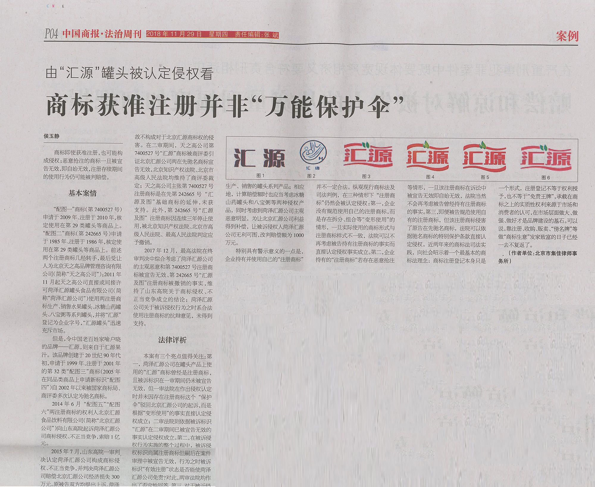 集佳文章《由“匯源”罐頭被認(rèn)定侵權(quán)看商標(biāo)獲準(zhǔn)注冊(cè)并非“萬能保護(hù)傘”》在《中國商報(bào)》發(fā)表