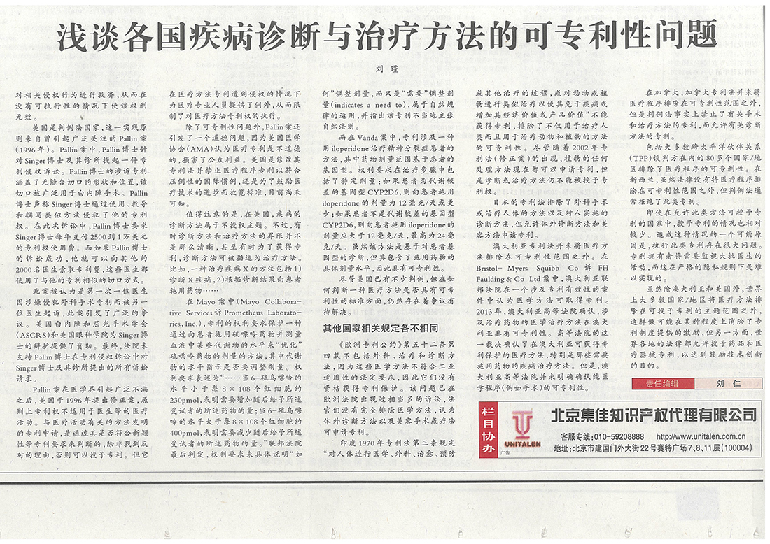 集佳文章《各國疾病診斷與治療方法的可專利性問題》在《中國知識產(chǎn)權(quán)報(bào)》發(fā)表