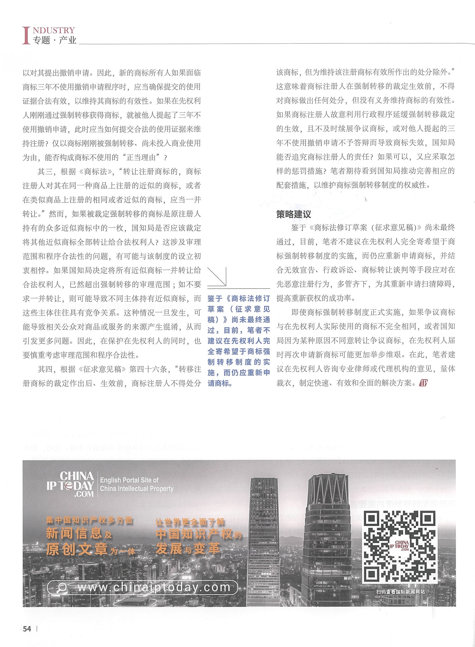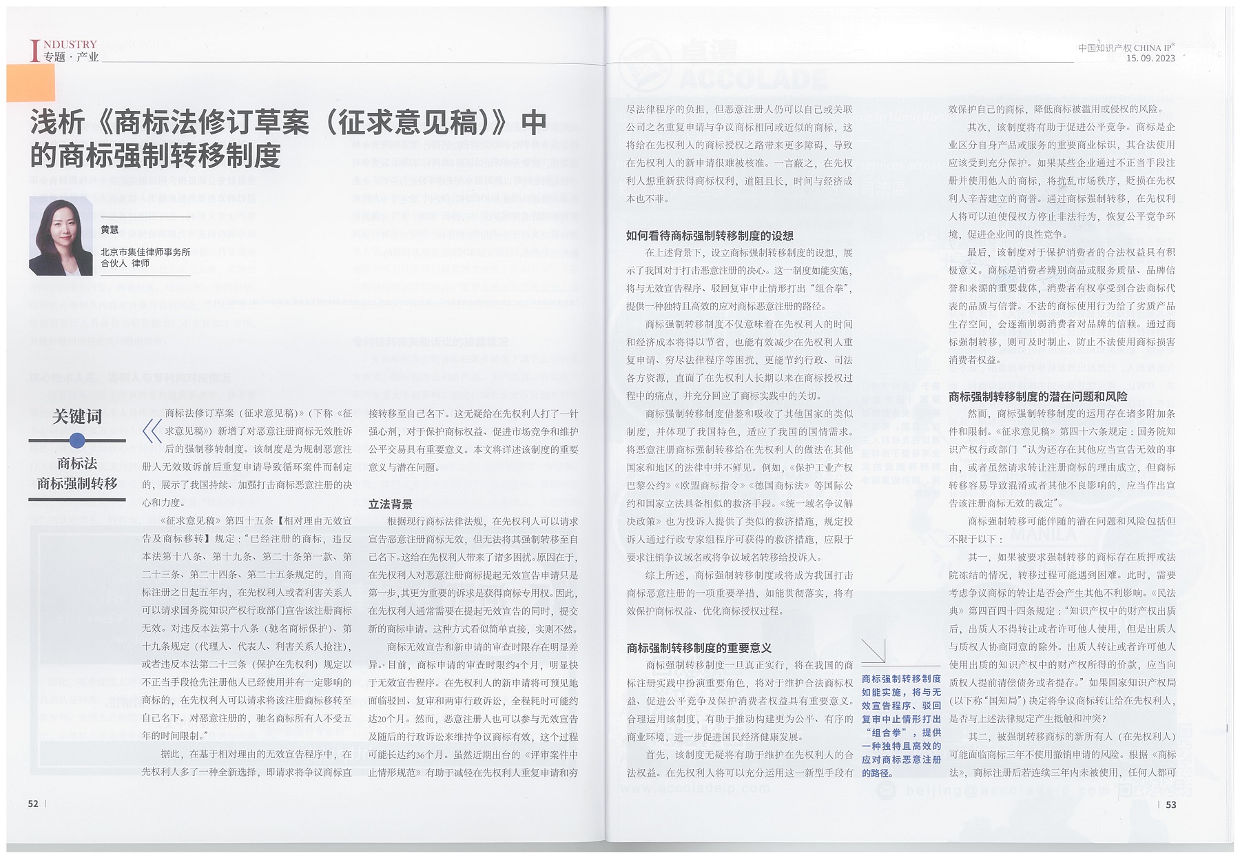 集佳文章《淺析<商標(biāo)法修訂草案(征求意見(jiàn)稿)>中的商標(biāo)強(qiáng)制轉(zhuǎn)移制度》在《中國(guó)知識(shí)產(chǎn)權(quán)》發(fā)表