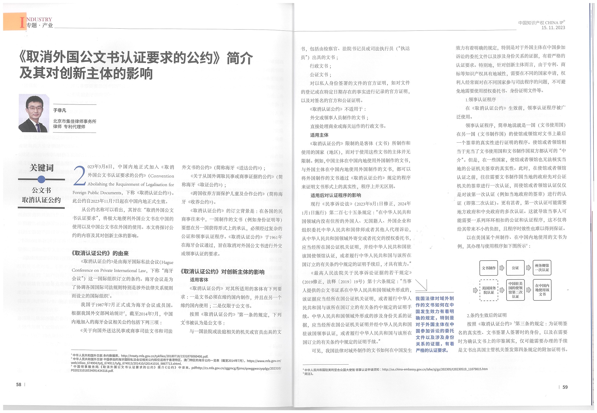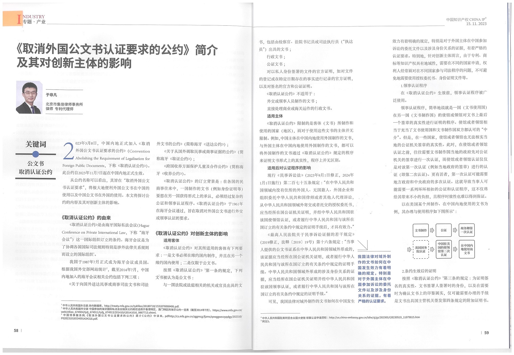 集佳文章《<取消外國公文書認(rèn)證要求的公約>簡介及其對(duì)創(chuàng)新主體的影響》在《中國知識(shí)產(chǎn)權(quán)》發(fā)表