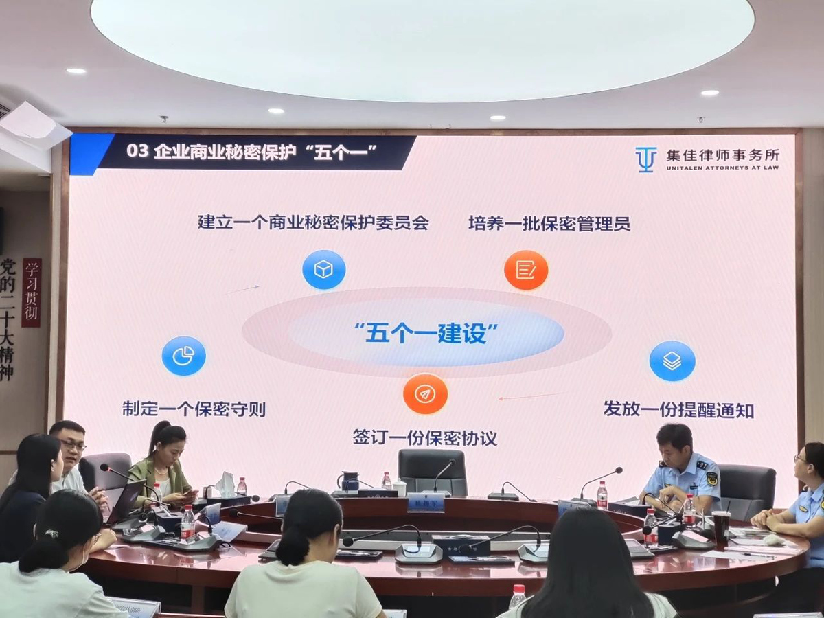 在系列培訓活動上,吳恙律師介紹了商業秘密的基本概念及構成要件,結合與專利制度的橫向對比分析商業秘密制度的要點及特征。進而引入商業秘密保護“五個一”建設的政策宣貫,包括建立一個商業秘密保護委員會、培養一批保密管理員、制定一個保密守則、簽訂一份保密協議、發放一份提醒通知。同時,吳恙律師進一步介紹了圍繞“五個一”政策的商業秘密保護體系建設方式,從企業宏觀預期及周期建設目標管理、商業秘密盤點梳理分級制度、全生命周期流程管理、涉密崗位及員工入離職管理、涉密載體及信息系統管理、內部培訓及教育警示制度、風險事件應急處置機制等方面逐步完善適合企業自身發展需求的商業秘密保護體系。