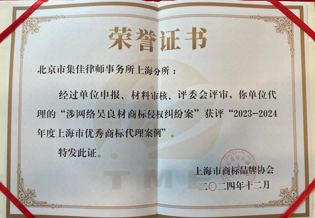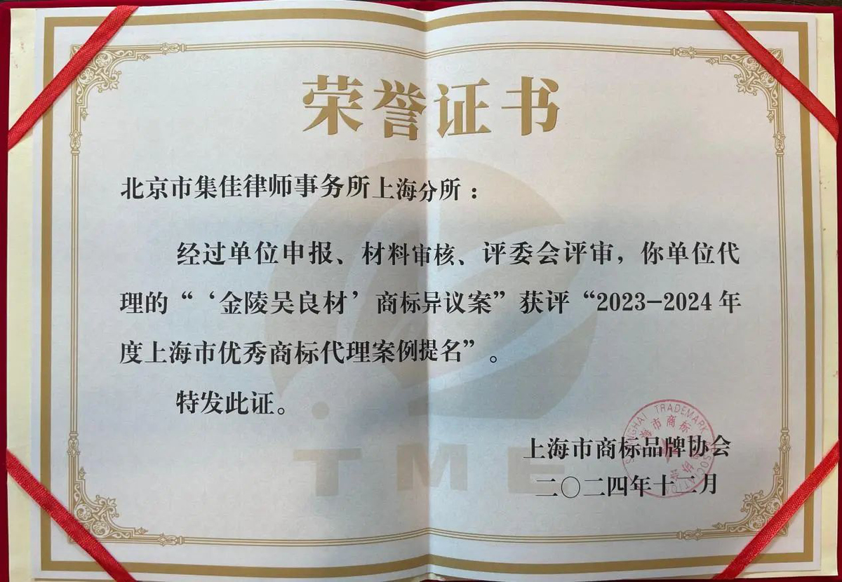 2025年1月7日,上海市商標品牌協會召開第六屆會員代表大會,會上表彰了被評為2023-2024年度“上海市優秀商標代理案例”及“上海市優秀商標代理案例提名”的案例,集佳上海分所的兩個案例成功入選