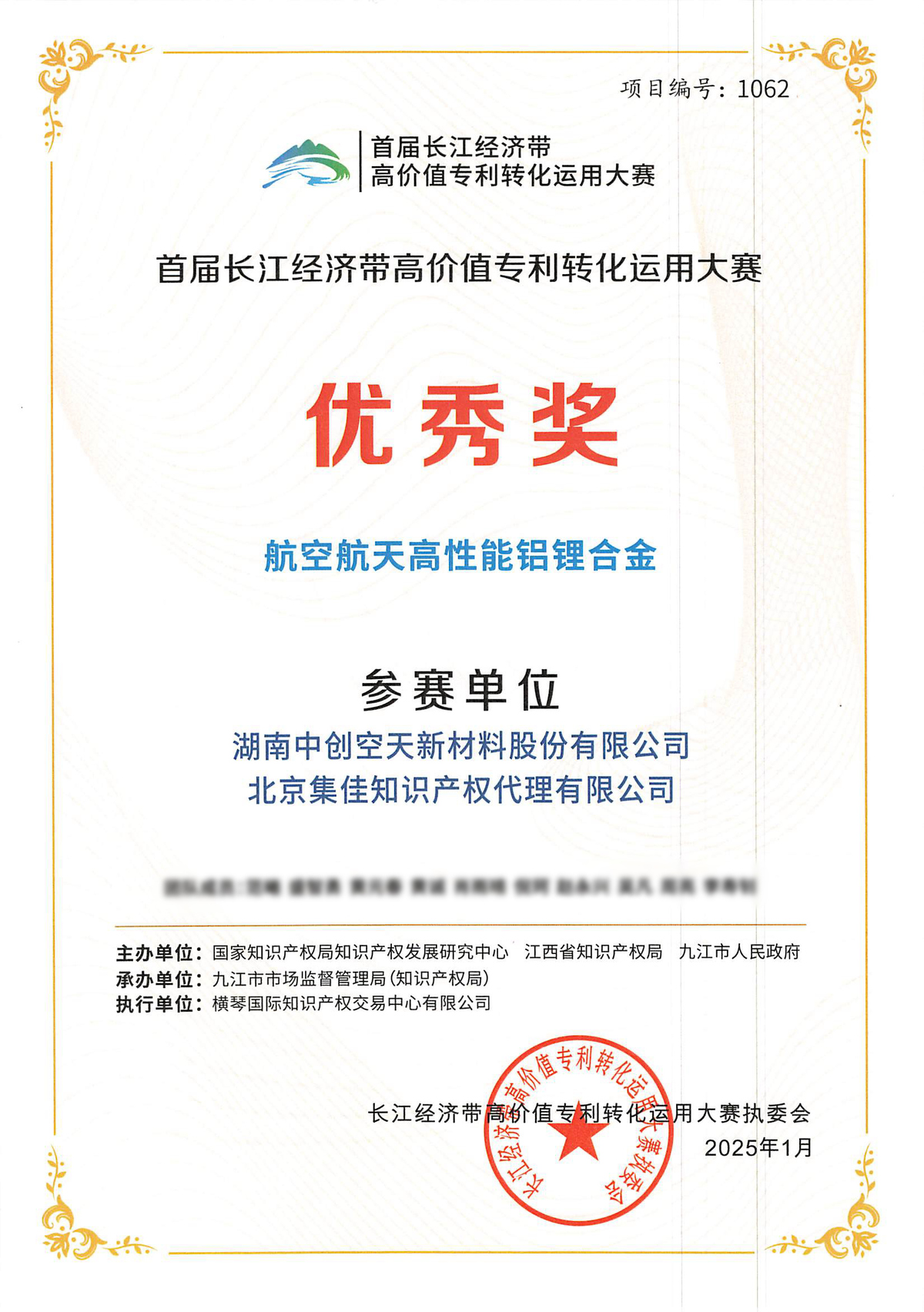 近日,在備受矚目的長(zhǎng)江經(jīng)濟(jì)帶高價(jià)值專利轉(zhuǎn)化運(yùn)用大賽全國(guó)決賽中,由北京集佳知識(shí)產(chǎn)權(quán)代理有限公司與湖南中創(chuàng)空天新材料股份有限公司聯(lián)合參賽的“航空航天高性能鋁鋰合金”項(xiàng)目脫穎而出,榮獲優(yōu)秀獎(jiǎng)。這一殊榮不僅是對(duì)項(xiàng)目團(tuán)隊(duì)卓越創(chuàng)新能力和不懈努力的高度認(rèn)可,也是雙方深度合作、共同推動(dòng)科技成果高效轉(zhuǎn)化的生動(dòng)見(jiàn)證。