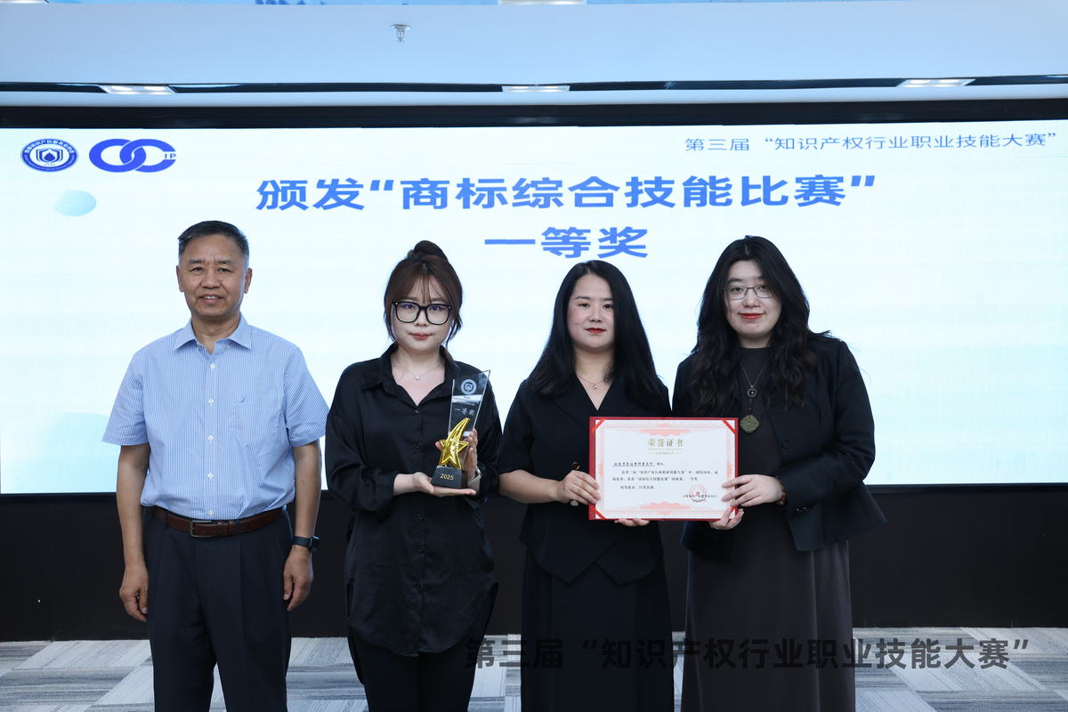 ▲甘紹寧副理事長為商標(biāo)組一等獎(jiǎng)選手郝博文、王嬌嬌、王斯沄頒獎(jiǎng)